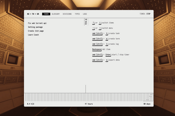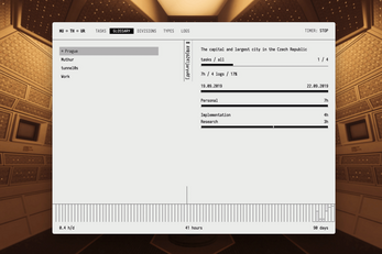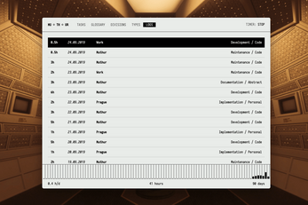- Time logs. Each log is connected to a term from your glossary, divisions of activities (Visual, Audio, Code), and type of activities (Search, Planning, Implementation). There are some default divisions and types, but you can create yours and delete the ones you do not need.
